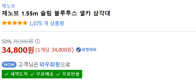 현재 별점 4.7점, 리뷰 1075개를 가진 제노브 1.55m 슬림 블루투스 셀카 삼각대! 지금 쿠팡에서 더 저렴하고 다양한 삼각대 제품들을 확인해보세요.