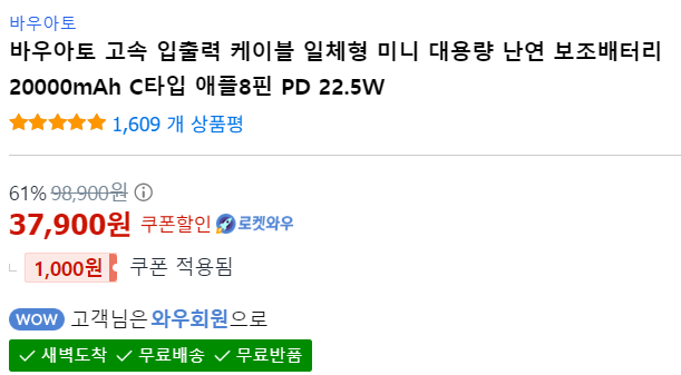 현재 별점 4.8점, 리뷰 1609개를 가진 바우아토 고속 입출력 케이블 일체형 미니 대용량 난연 보조배터리 20000mAh C타입 애플8핀 PD 22.5W! 지금 쿠팡에서 더 저렴하고 다양한 보조배터리 제품들을 확
